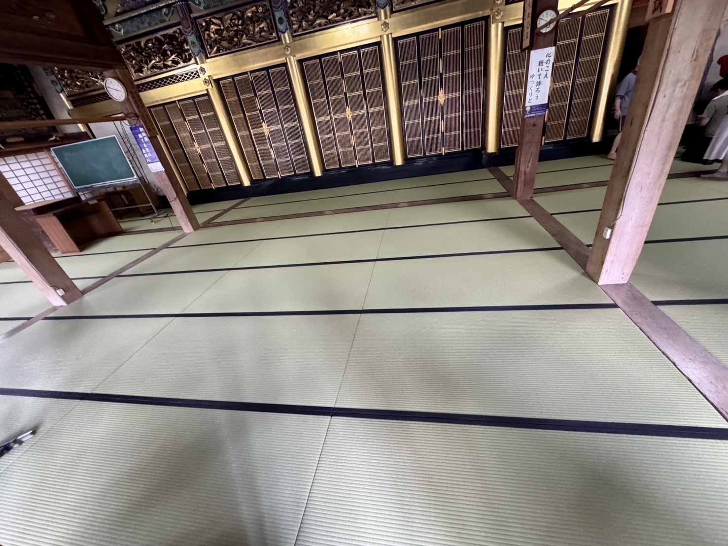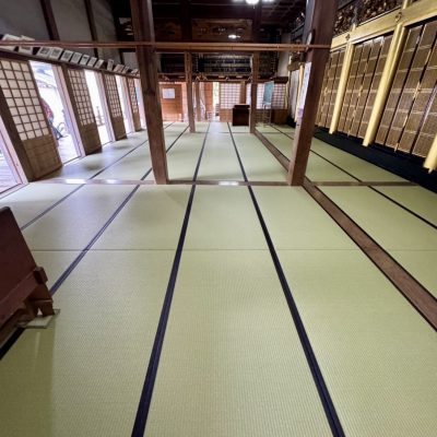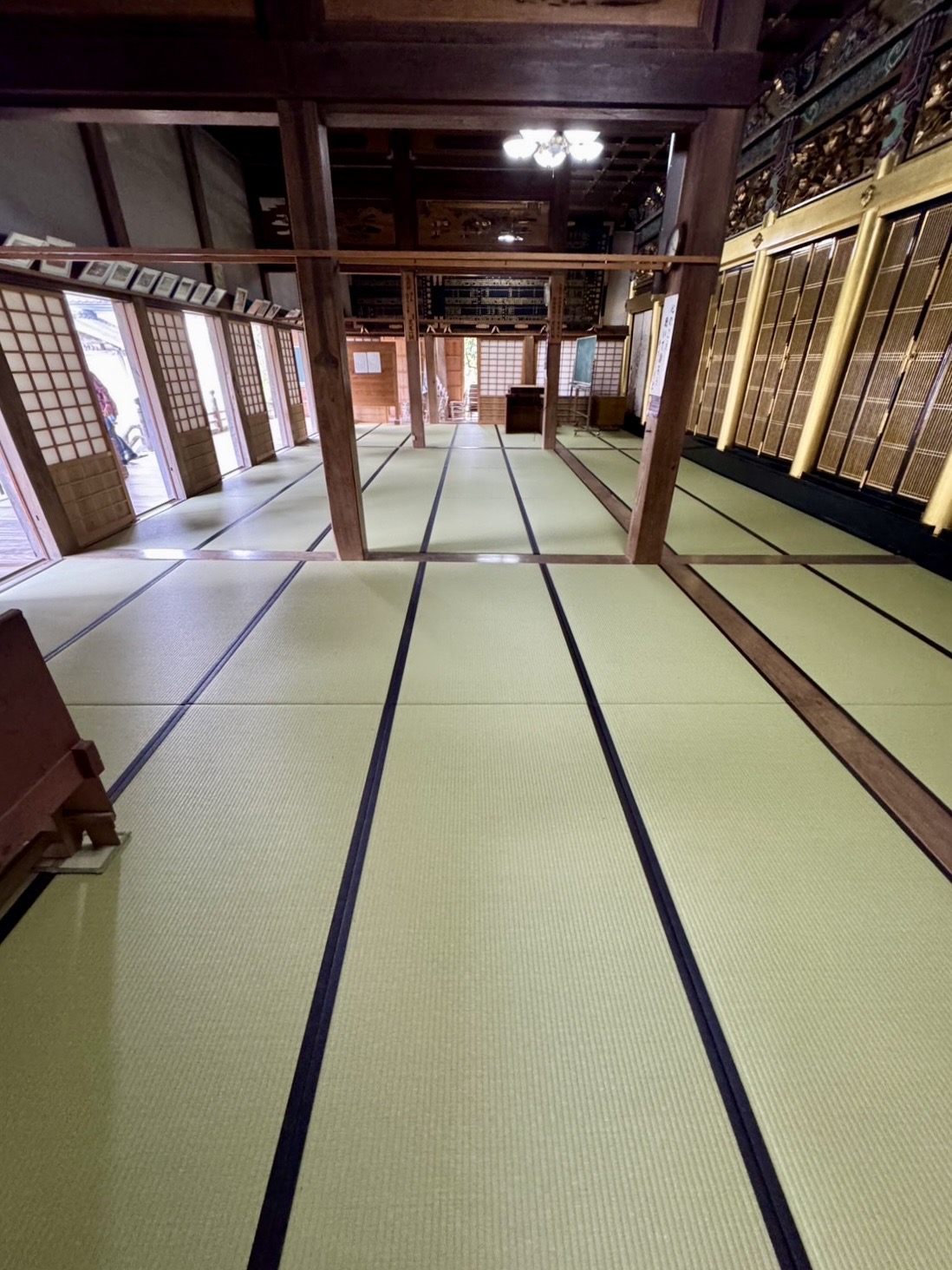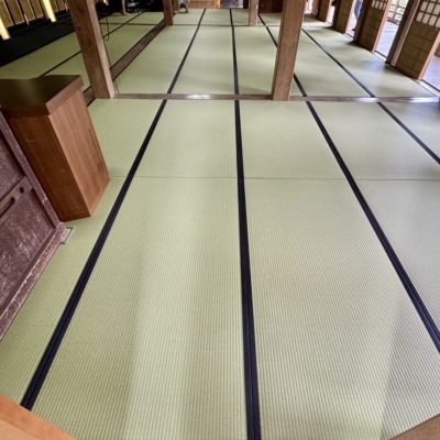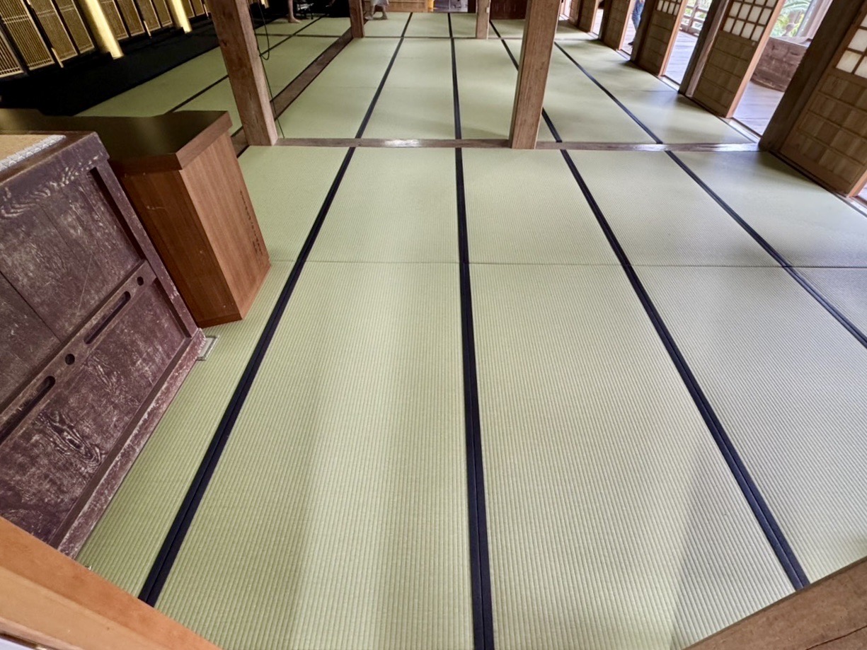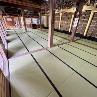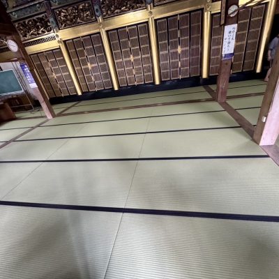 先日は、お寺の本堂に40畳の畳を納品いたしました。職人3名で施工にあたり、本堂部分には落ち着いた黒い畳縁を用いて仕上げております。