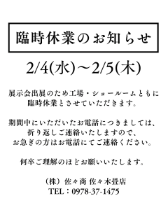 2月4日(水)・5日(木)は、東京ギフトショーの展示会出展のため、工場・ショールームともに臨時休業とさせていただきます。
